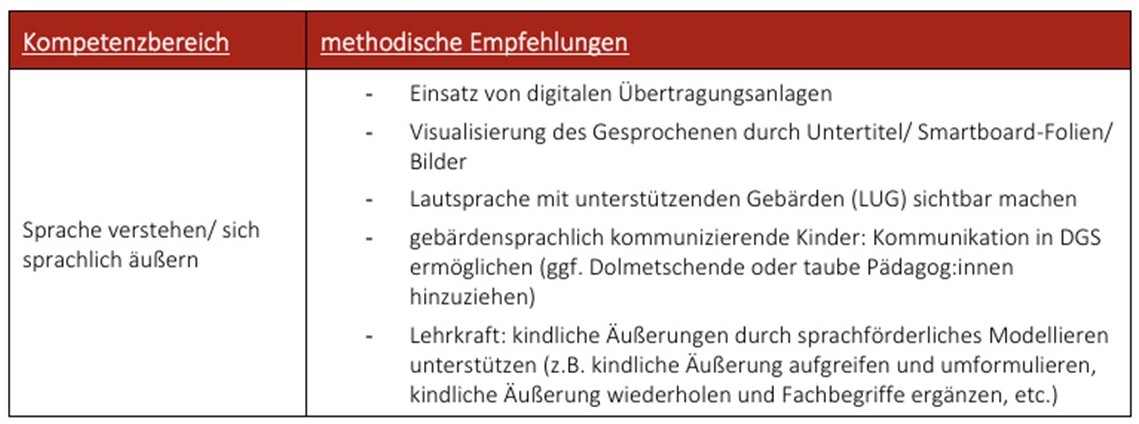 Die wichtigste Bedingung ist eine barrierefreie Unterrichtskommunikation. In der Klasse muss eine für alle verständliche Kommunikationsform etabliert sein, um auch interaktive Gespräche zu ermöglichten. Durch Anpassung der eigenen Sprache an die kommunikativen Möglichkeiten der Lernenden kann die Lehrkraft im Unterrichtsgespräch Verständnis sichern und sprachfördernde Modellierungstechniken anwenden (Stecher/ Rauner 2019: 64ff).
