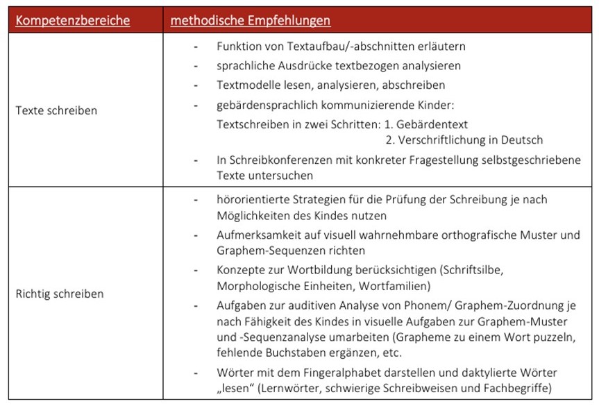 Im Folgenden werden für die fünf Kompetenzbereiche des Deutschunterrichts A Sprechen/ Gebärden und Zuhören/ Zusehen, B Schreiben, C Lesen, D Sich mit Texten und Medien auseinandersetzen, E Sprache und Sprachgebrauch untersuchen [1] . Forschungserkenntnisse und Praxiserfahrungen angeführt, die den Sprachlernbedingungen von Schüler*innen mit Hörbehinderung für den Deutschunterricht entgegenkommen.