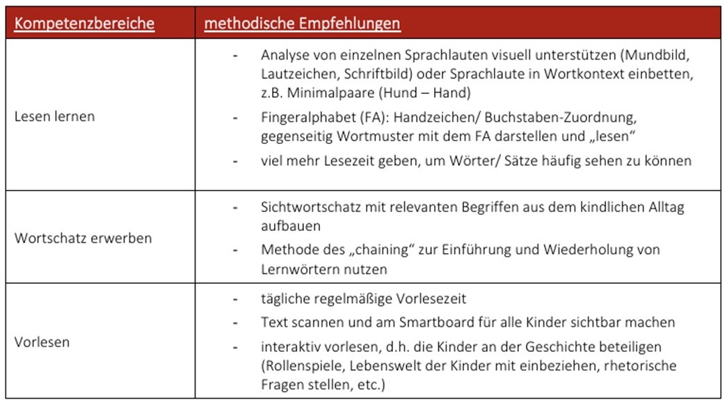 Vorlesen: Im Primarbereich sammeln Schüler*innen mit Hörbehinderung beim Vorlesen erste literarische Erfahrungen. Vorlesen eröffnet die Dimension der Fiktionalität, die über das konkrete Erleben im Hier und Jetzt hinausgeht. Die Schüler*innen lernen den Aufbau von Geschichten kennen, typische Handlungsverläufe und Figurenverhalten, sodass sie eine Erwartungshaltung für narrative Strukturen entwickeln können. Dank digitaler Technik können Sätze und Texte für alle sichtbar am Smartboard gezeigt werden, sodass Vorlesen keine ausschließliche Leistung des Zuhörens, sondern auch des Zusehens sein kann und die Lernenden auditiv entlastet werden. Wenn mit LUG oder in DGS vorgelesen wird, können Gebärden während der gebärdeten Erzählung interaktiv mit Schriftbild und Bildern sinnstiftend verknüpft werden. Neue Wörter können in einem bedeutungsvollen Kontext gelernt und gemeinsam mit den Lernenden mit dem Fingeralphabet dargestellt werden.