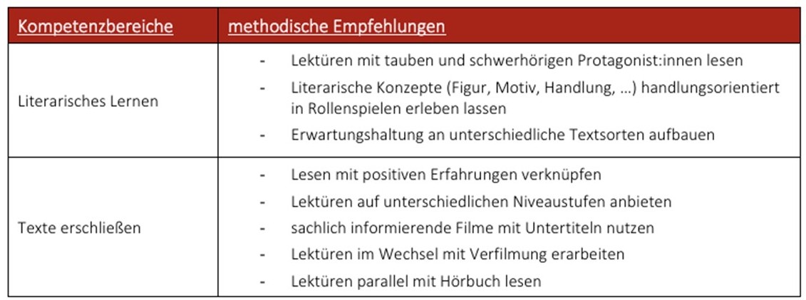 Literarisches Lernen: Das Lesen von literarischen Texten/ Lektüren ermöglicht den Schüler*innen mit Konzepten wie Figur, Handlung und Konflikt Erfahrungen zu sammeln. Dies ist besonders motivierend, wenn es sich um schwerhörige oder taube Protagonist:innen handelt, deren Bedürfnisse und Konflikte den Lernenden vertraut sind und mit denen sie sich identifizieren können. Verhalten und Handlungsmotive von Figuren erkennen und beschreiben zu können, stellt eine wichtige Kompetenz zur Texterschließung dar. Hilfreich sind hier handlungsorientierte Verfahren mit Rollenspielen, in der die Schüler:innen in Rollen Konflikte „erleben“ können. Die Kenntnis über typische literarische Strukturen lässt die Schüler*innen eine Erwartungshaltung aufbauen, die das allgemeine Textverständnis beim Lesen von unterschiedlichen Textsorten, wie Märchen, Fabeln, Jugendromane oder Kurzgeschichten, unterstützt.