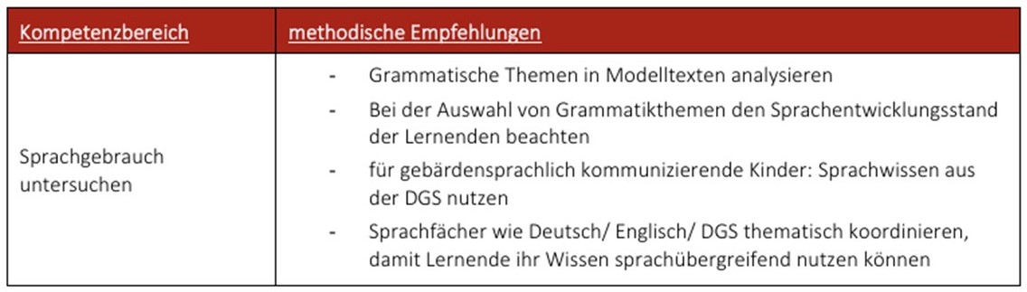 In der Praxis hat sich eine Abstimmung zwischen den Fächern Deutsch/ Englisch/ ggf. DGS hinsichtlich grammatischer Themen als sehr förderlich für das Sprachlernen von Schüler*innen mit Hörbehinderung erwiesen. Es ermöglicht den Lernenden sprachübergreifend auf bereits bekannte Konzepte zurückgreifen zu können und ihr mehrsprachiges Wissen einzubringen.